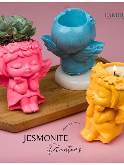 I work mostly with Jesmonite, an eco-friendly material that feels cool and smooth like stone. Every piece I make is a bit different - not factory perfect, just real. You’ll find trays and coasters shaped like roses, terrazzo, or with beaded edges. Planters and vases for those who want their plants to stand out - some look like angels or classic busts, all in soft colours. Tea-light holders come in lotus and daisy shapes, with marbled or solid colours, adding a little festival to your evenings.