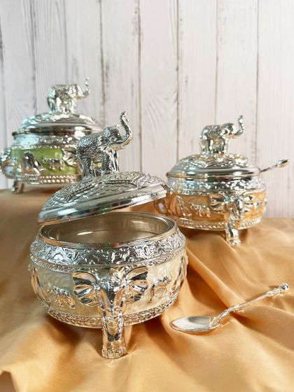 We offer elegant gifting options crafted with premium materials like silver-plating, rose quartz, and Murano glass. Our collection includes intricately designed dry fruit boxes, keepsake boxes, sugar pots, and wedding favors.
