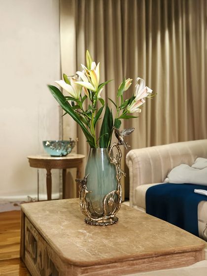 - Sometimes, you’ll find a glass vase with sculpted metal birds or forms that catch the light in just the right way. These are true statement centerpiece decor.