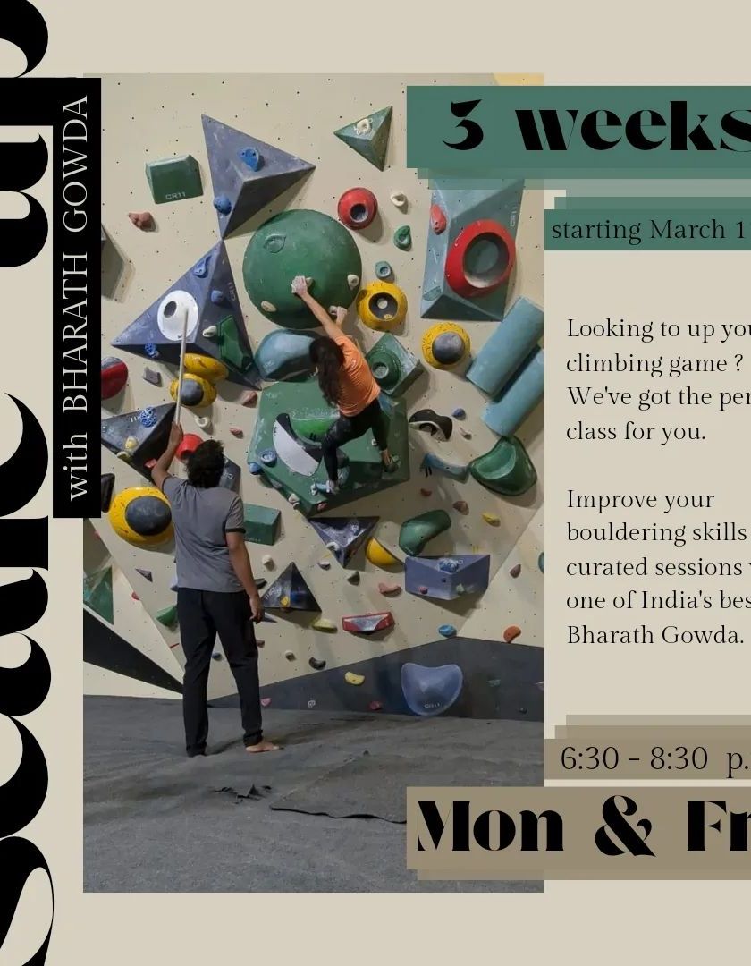 This is where your climbing journey begins. My three-week "Scale Up" course, led by one of India's top climbers Bharath Gowda, covers everything from basic footwork and finger strength to reading routes. It's designed to build your confidence and skills from the ground up.