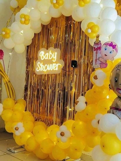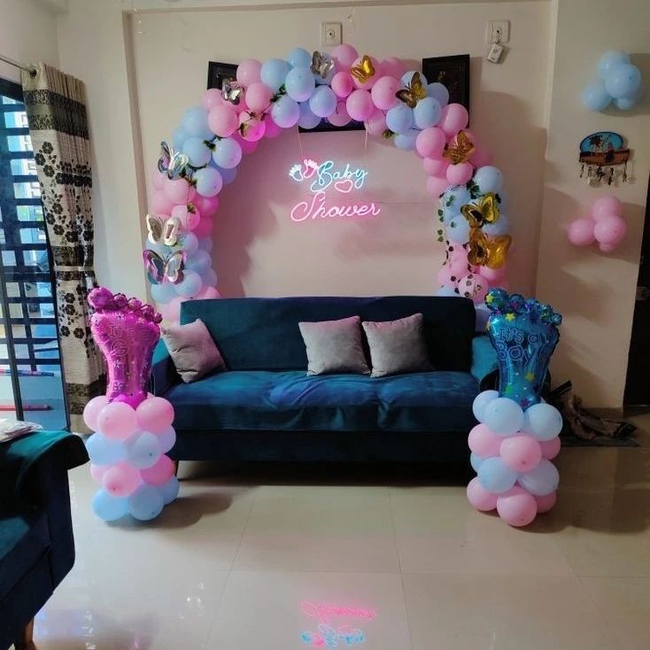 I design beautiful backdrops for both modern baby showers and traditional Godh Bharayi ceremonies. My services range from creating a single, Instagrammable photo corner in your living room to decorating an entire hall, using elements like balloon garlands, neon signs, and themed props.