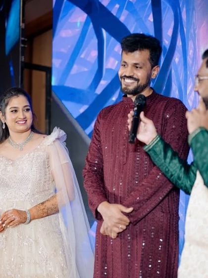 I host all your wedding events, run interactive games, switch between English, Hindi, Kannada, and Telugu, and handle everything so you and your guests can enjoy without stress.
