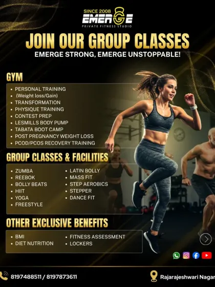 Hey, we’re Emerge Fitness. Started back in 2008, not just to run a gym, but to give folks a place where energy and discipline matter. Namma trainers treat you like family - you come tired, you go out strong. We’ve seen moms and daughters, students, all finding their spot here. We celebrate everything together, from Yoga Day to Kannada Rajyotsava. It’s not just fitness, it’s an Emerge family experience.