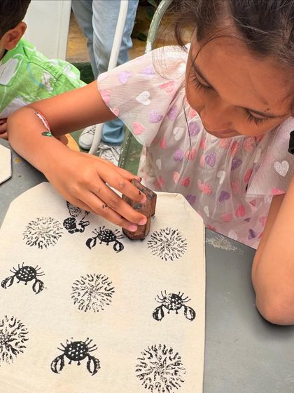 In these workshops, children and adults learn the traditional art of block printing using safe, carcinogenic-free inks. Participants create their own designs on items like cotton tote bags and paper, learning about animal species or patterns while making a beautiful, sustainable product to take home.