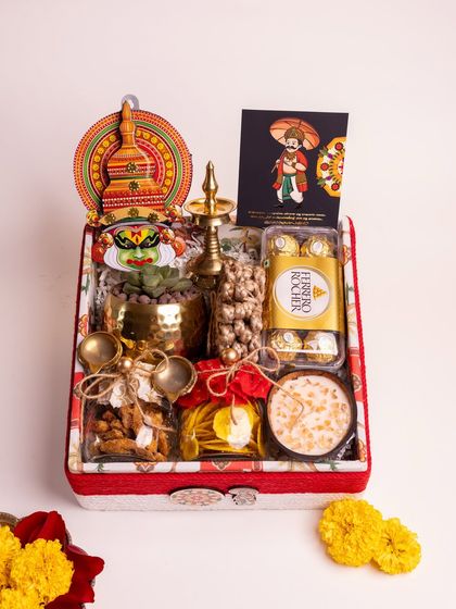 - Decor: One small scented candle (tin or glass) and a small festive keepsake (e.g., Kathakali head or ornament).