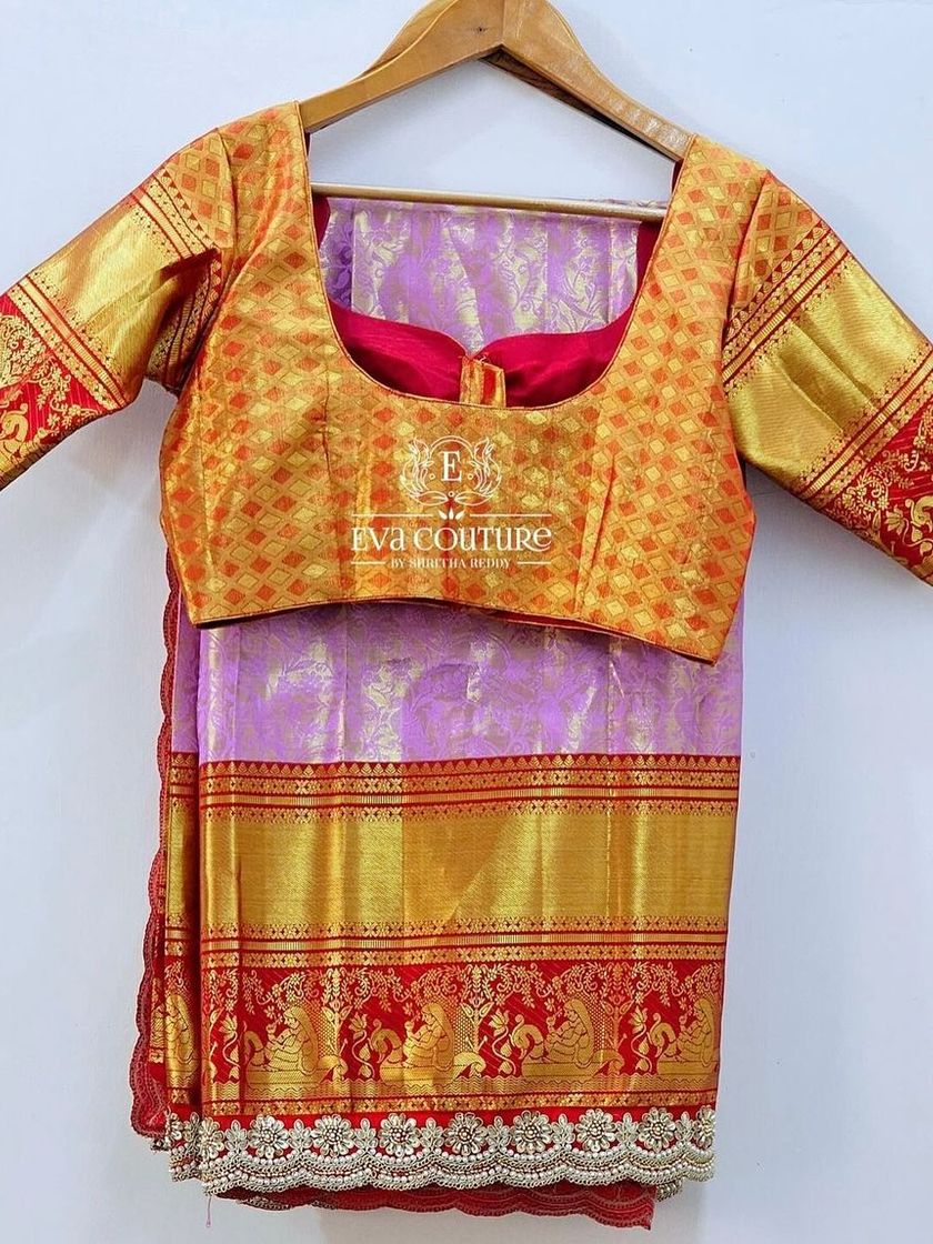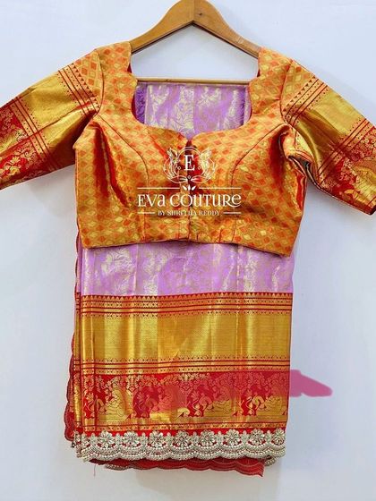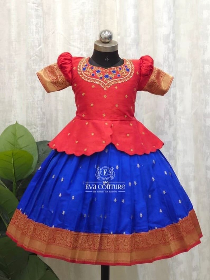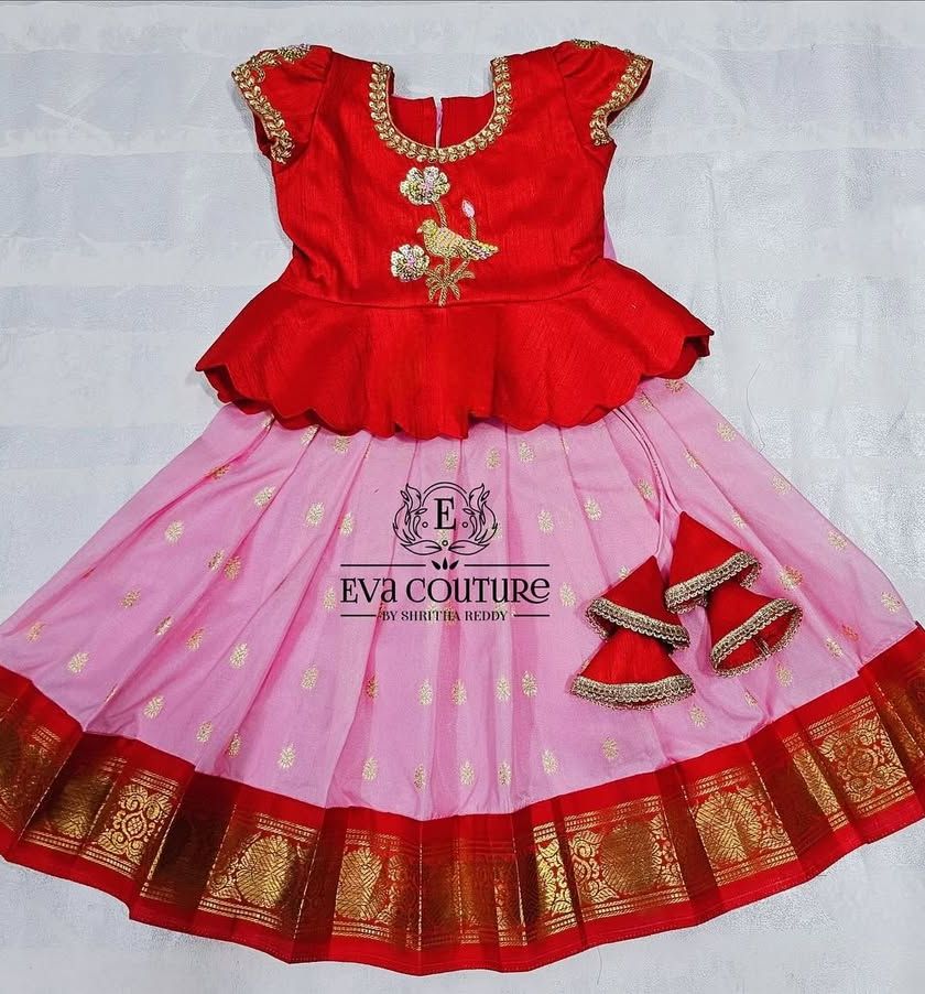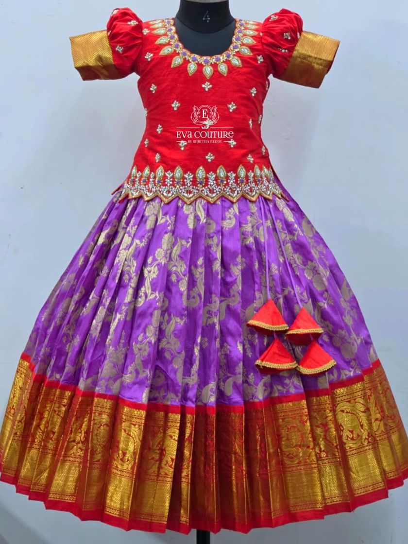 My collection of traditional South Indian pattu pavadais, perfect for girls of all ages. I use authentic Kanchi and Banarasi silks with rich zari borders and pair them with beautifully crafted blouses for a timeless look.