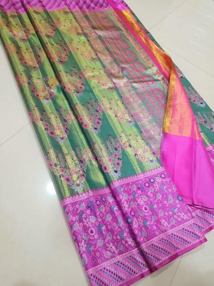 We specialize in luxurious Kanchi Pattu and Tissue Kanchi Pattu sarees, featuring intricate maggamwork on borders and blouses. Our sarees showcase detailed embroidery and vibrant color palettes, maintaining traditional craftsmanship while incorporating contemporary design elements.