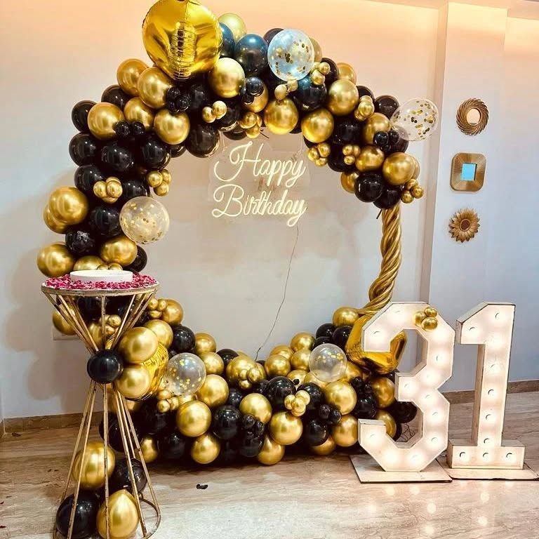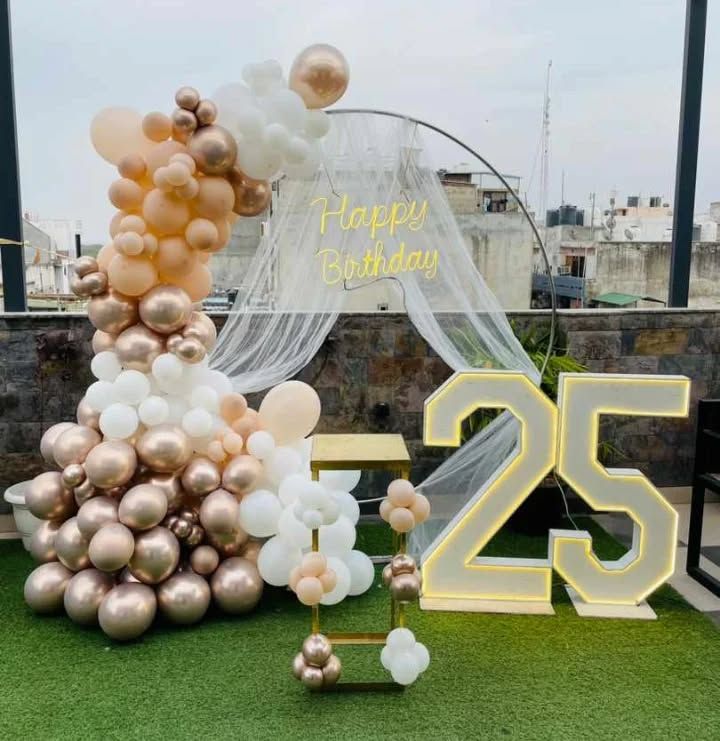 For adult birthdays, anniversaries, and sophisticated parties, I design modern and elegant decorations. I use stylish color combinations like black and gold, rose gold and pink, or classic white and silver, along with features like neon signs, marquee numbers, and sequin walls to create a chic and memorable event.