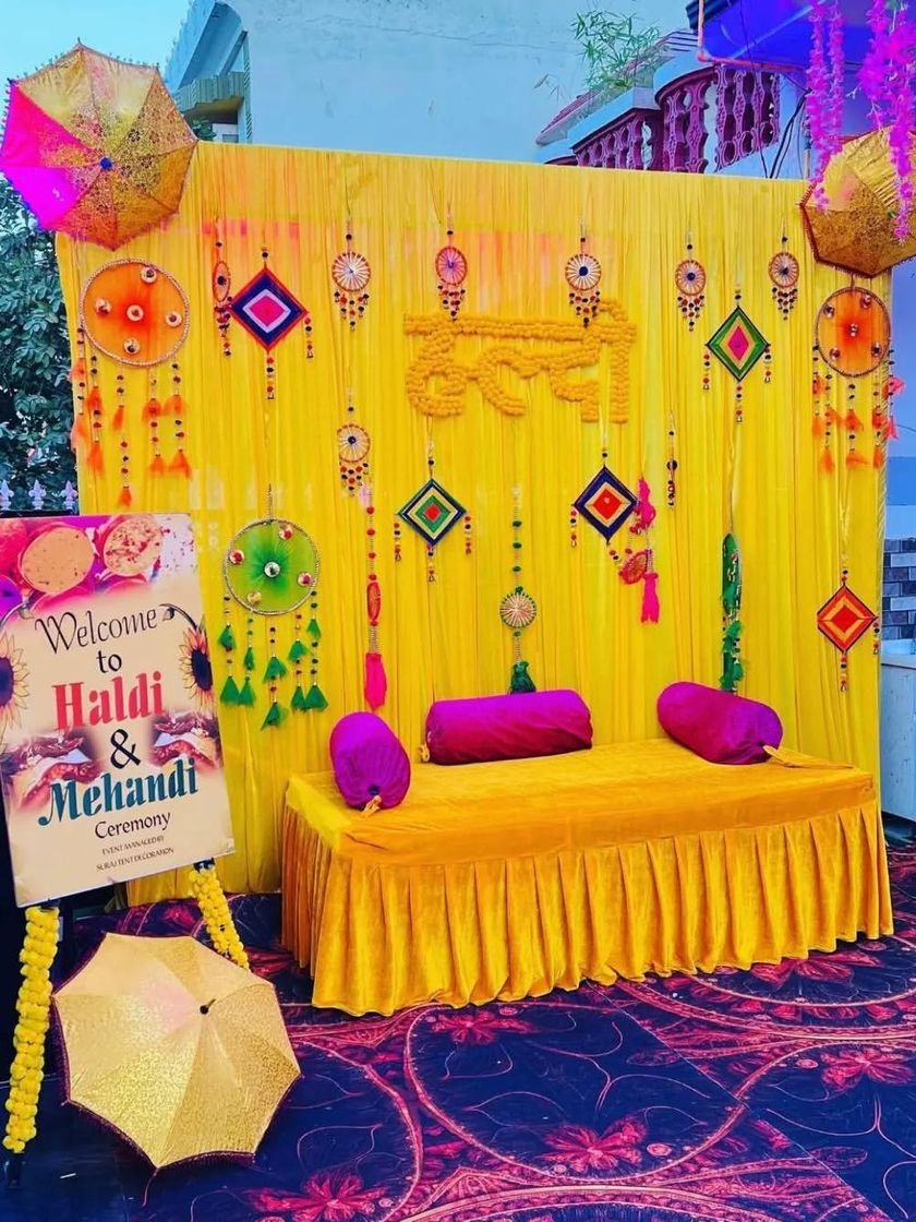 I create bright and traditional backdrops perfect for your Haldi and Mehendi ceremonies at home, on a terrace, or in a lawn. These setups feature classic yellow drapes, marigold flower elements, and decorative props like Rajasthani umbrellas and custom signs to bring festive energy to your event.