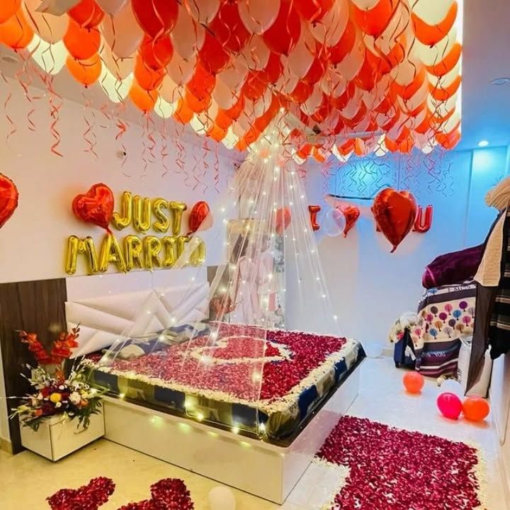 I create unforgettable romantic experiences with custom room decorations for proposals, anniversaries, or first nights. These setups can include anything from rose petal arrangements and fairy light canopies to balloon-filled ceilings and personalized neon signs.