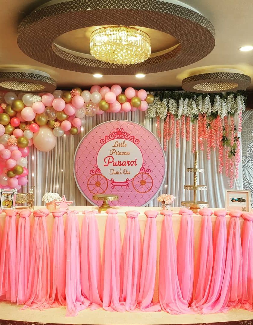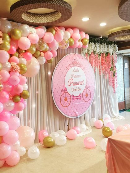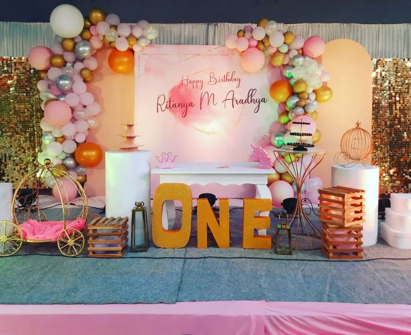 I design complete princess themed birthday setups, focusing on classic color palettes like pink and gold. These packages often include a grand stage backdrop, a welcoming entrance arch, and personalized elements like a milestone photo wall.
