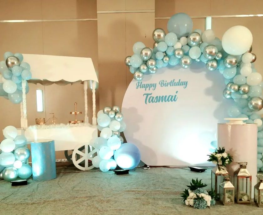 Beyond full themes, I design and build custom backdrops and entrance arches for any occasion. This includes modern circular backdrops with balloon garlands, elegant floral arches for naming ceremonies, and shimmer panel walls for a touch of glamour.