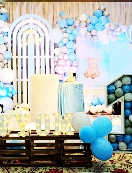 I create special decoration packages for first birthday parties, a milestone worth celebrating in style. Setups often include large light-up numbers, custom name signs, and themed props, available in a variety of color schemes like pastel pinks, golds, and blues.