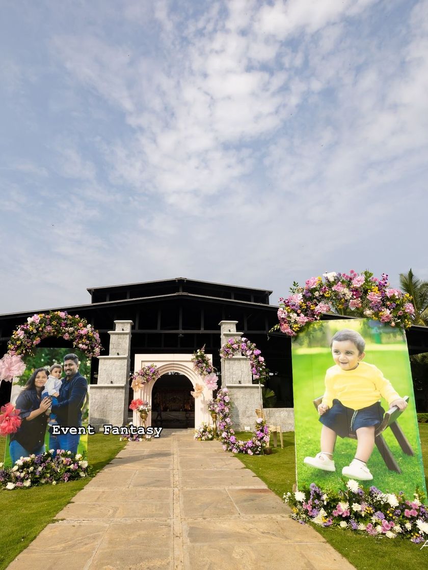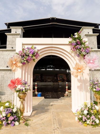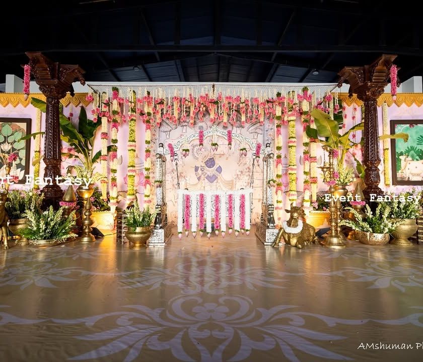 I specialize in creating authentic and sacred atmospheres for naming ceremonies (Namkaran) and other family rituals. These designs feature classic South Indian elements like banana leaf backdrops, fragrant jasmine and marigold garlands, and traditional brass decor like samai lamps and ornate urlis.