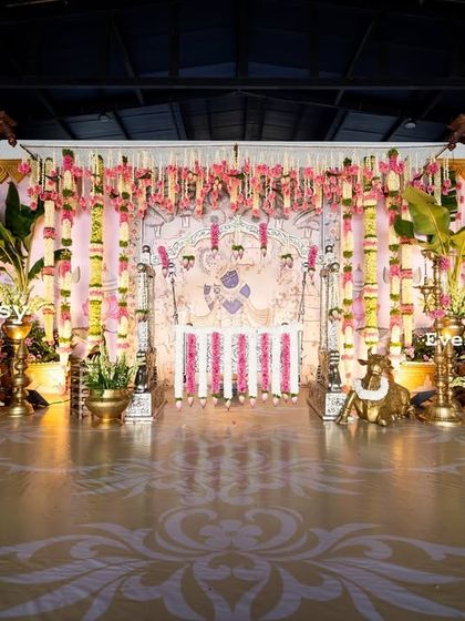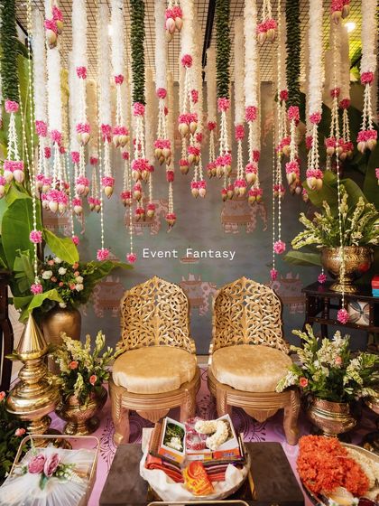 I have a special love for creating authentic South Indian wedding decor. These setups feature classic elements like intricately carved wooden pillars, fragrant jasmine and tuberose garlands, and sacred banana leaves, all brought together to create a divine atmosphere for your Sati Kalyana.