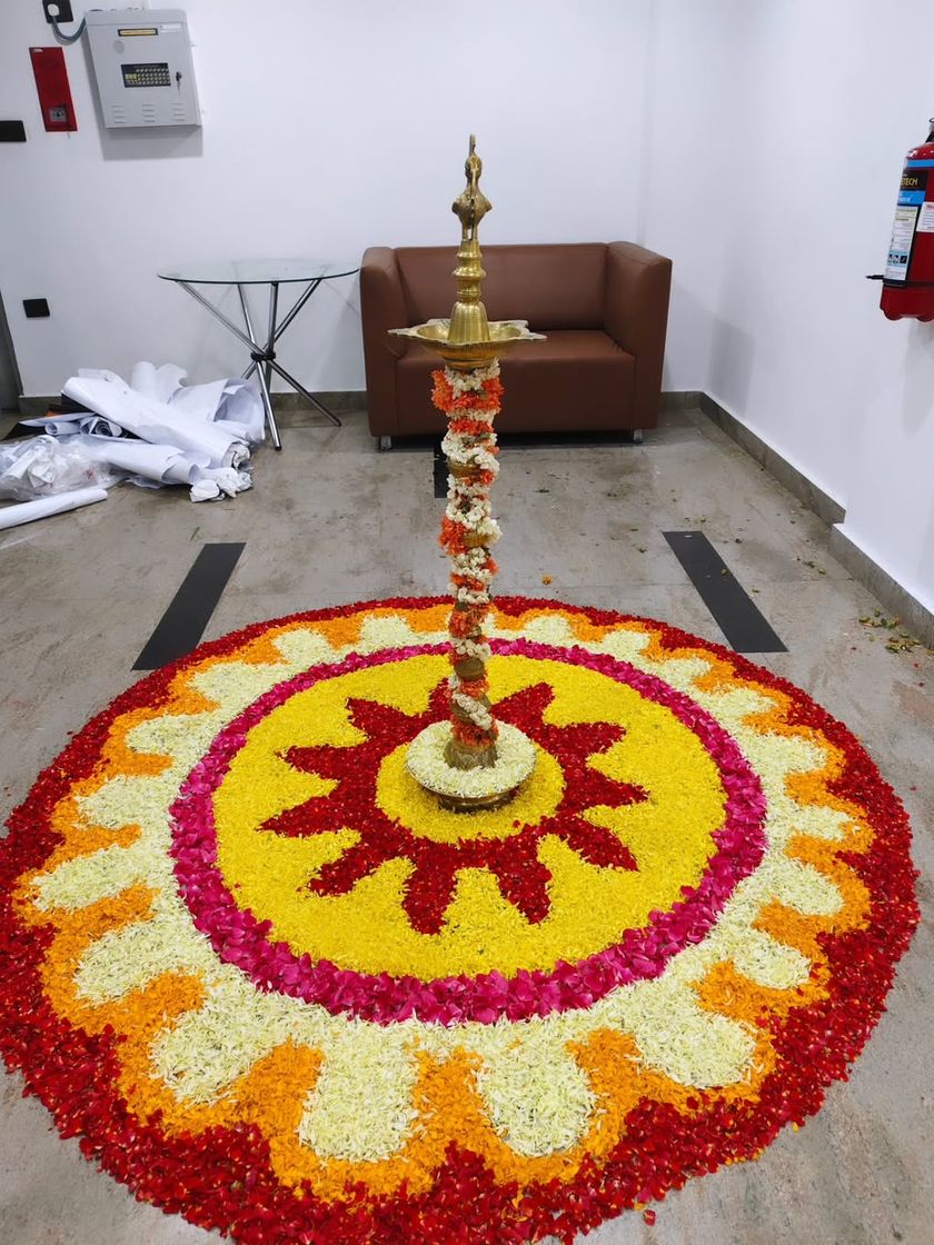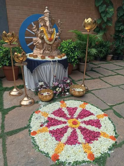 I specialize in blending traditional Indian decorative elements into a professional corporate setting. This includes creating beautiful flower rangolis, setting up auspicious brass lamps (diyas), and designing setups for poojas.