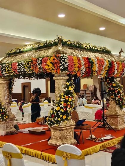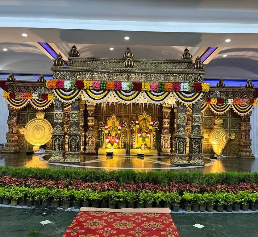 I build authentic mandaps that honor your traditions, including classic temple-style structures and peacock-themed designs. I also create sacred spaces for deities like Ganesha and Venkateshwara, ensuring every element is perfect for your ceremony.