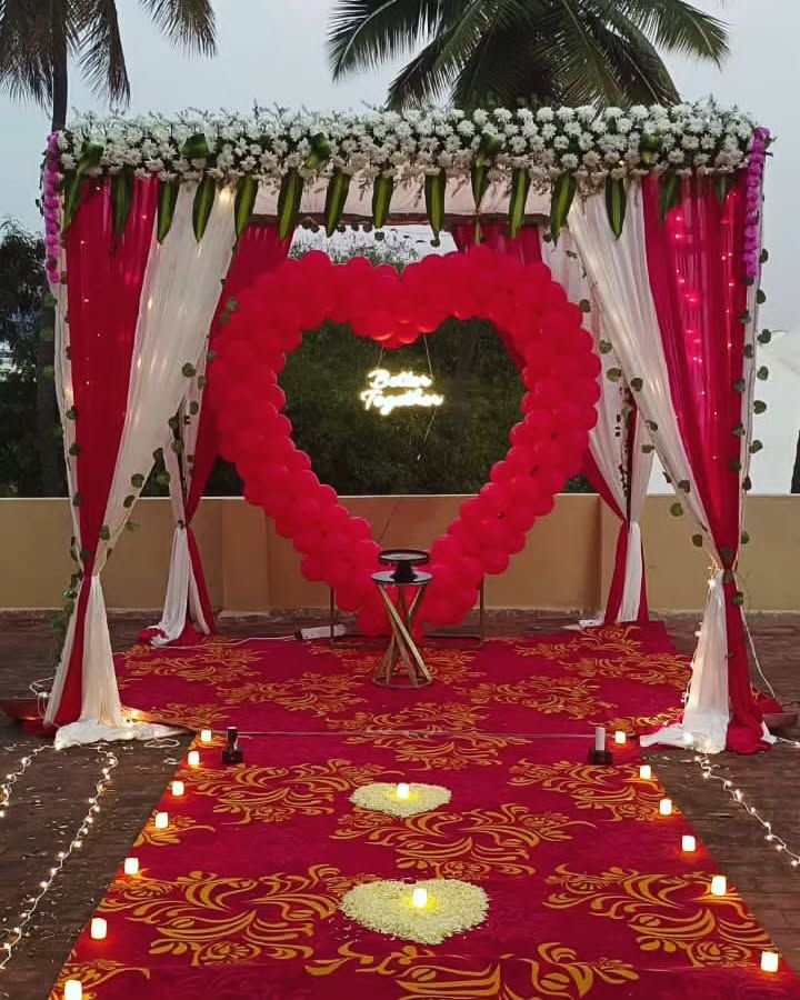 I create magical settings for your most personal moments. Whether it's a surprise proposal with a heart-shaped arch and cold-fire pyros, a romantic candlelight dinner, or elegant first-night room decorations, I handle all the details.