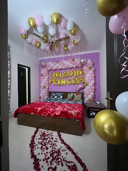 - Arrangement: Half attached to ceiling with hanging ribbons (faux-helium effect) and half scattered on floor/bed.