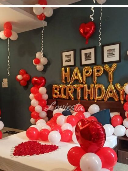Transforming your room into a surprise retreat is kind of my jam. Expect helium balloons everywhere - ceiling, floor, arches - and fairy lights that turn the whole space dreamy. I can go for a classic red-white theme, or switch it up with metallics or heart-shaped foils. For that personal touch, I love adding your favourite photos to the decorations. 'Anniversary room decoration ideas' is what I live for.