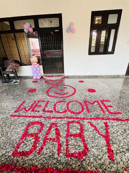 I create beautiful and heartfelt welcome arrangements for your loved ones. This includes traditional flower petal rangoli for housewarmings or welcoming a newlywed couple, and cute balloon setups for bringing a new baby home.