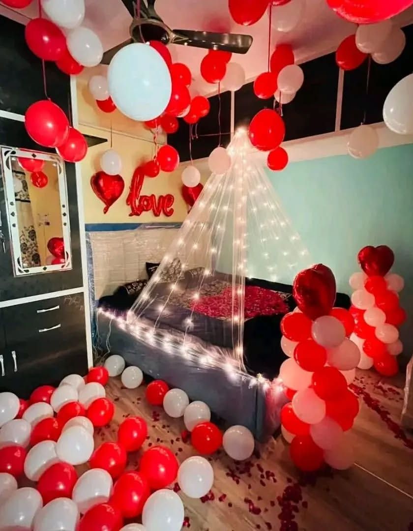 I can transform any bedroom into a romantic retreat for your partner. My services include filling the room with ceiling and floor balloons, creating fairy light canopies over the bed, arranging rose petals, and adding personalized foil balloons.