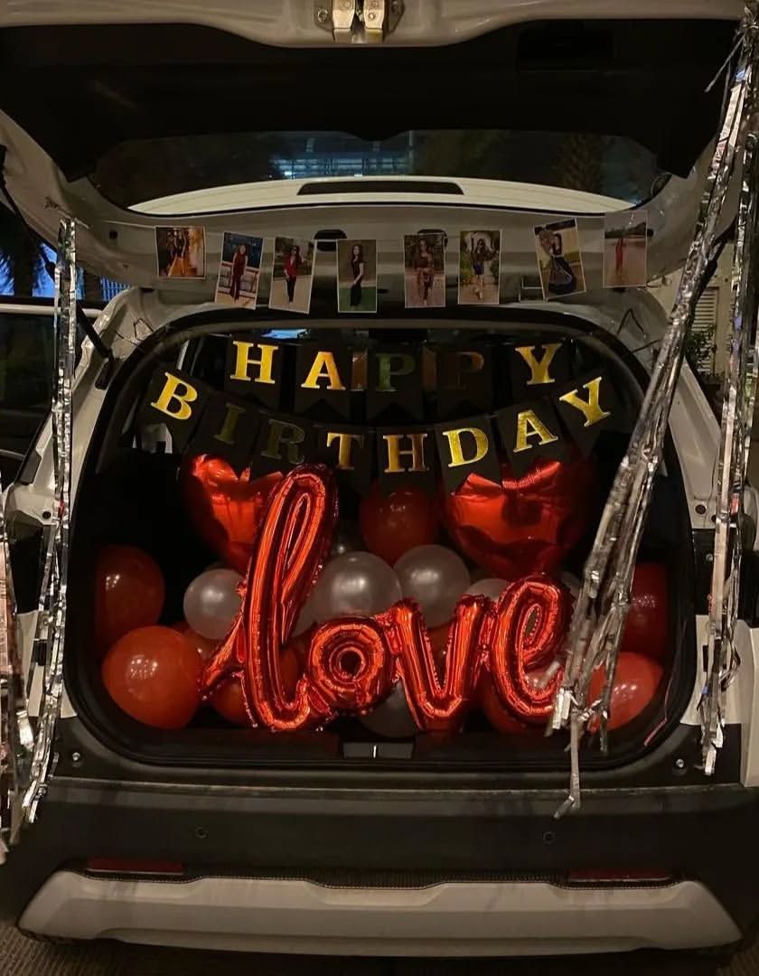 Take the celebration on the road with a surprise car boot decoration. I fill the car's trunk with balloons, fairy lights, photos, and a special message for a unique and memorable birthday or anniversary surprise.