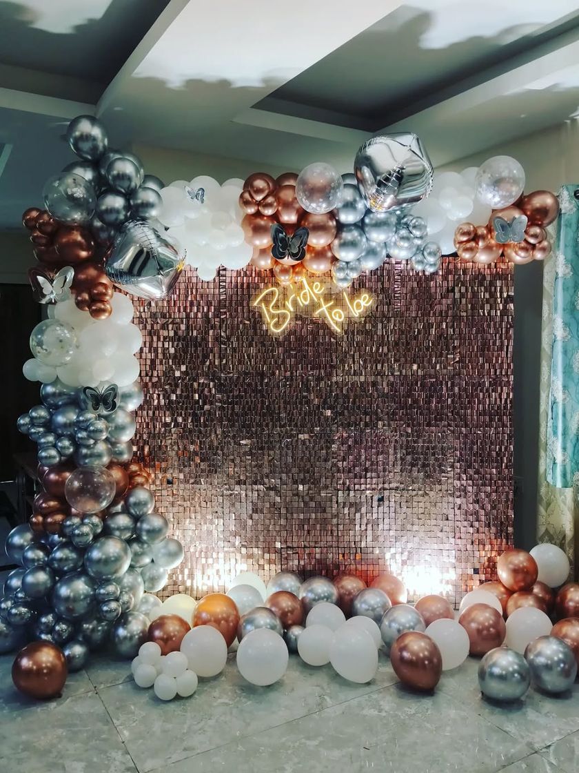 Celebrate the 'Bride to be' with a stylish party setup. I offer glamorous sequin backdrops, chic balloon arches in various colors like rose gold or pastels, and fun neon signs to make her feel special before her big day.