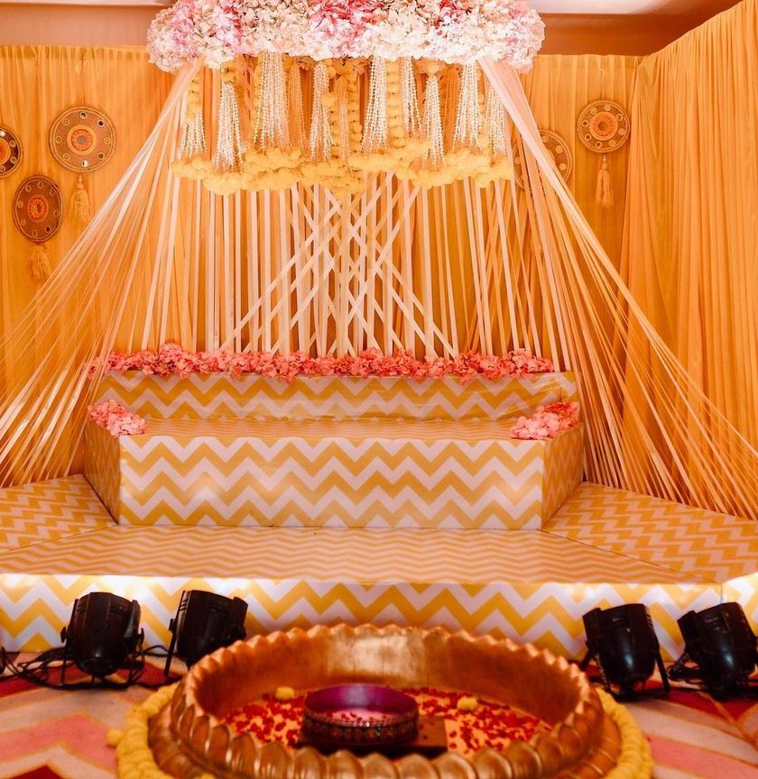 The pre-wedding functions are all about colour, joy, and energy. I specialize in creating distinct themes for each ceremony, from traditional yellow and gold Arisina (Haldi) setups with marigolds and brass urulis, to vibrant, bohemian Mehendi stages with tassels and quirky props. Each setup is designed to be the perfect backdrop for these happy moments.