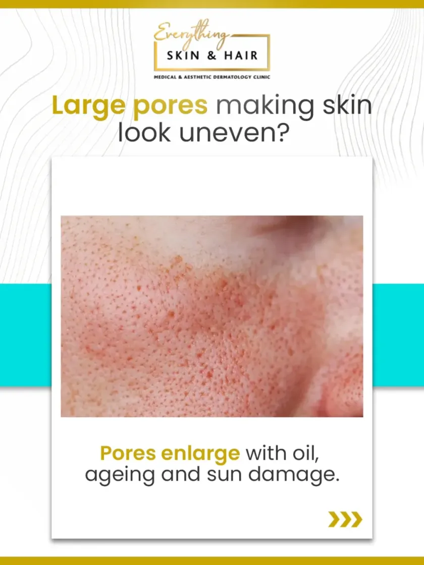 Enlarged pores are often caused by excess oil, sun damage, and loss of collagen. My treatment plans address these root causes using a combination of topical retinoids, collagen-boosting microneedling, and professional peels with salicylic or mandelic acid to clear plugs and refine skin texture.