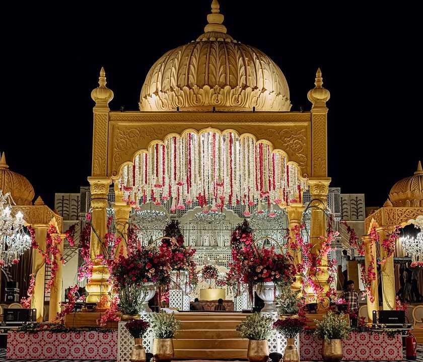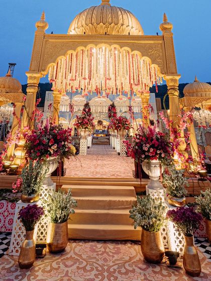 This design transforms a modern hillside venue into a royal Rajasthani paradise, inspired by the opulence of Udaipur. The 'Shahi Jharokha' or royal balcony concept is central, with golden-domed structures, intricate jali work, and dramatic floral arrangements in shades of pink and red creating a breathtaking backdrop for a wedding that feels both grand and timeless.