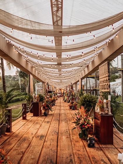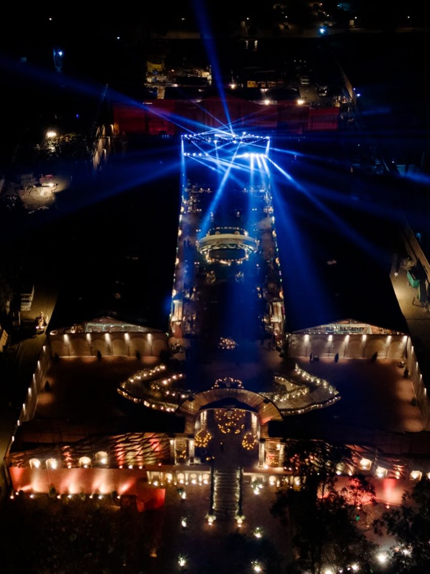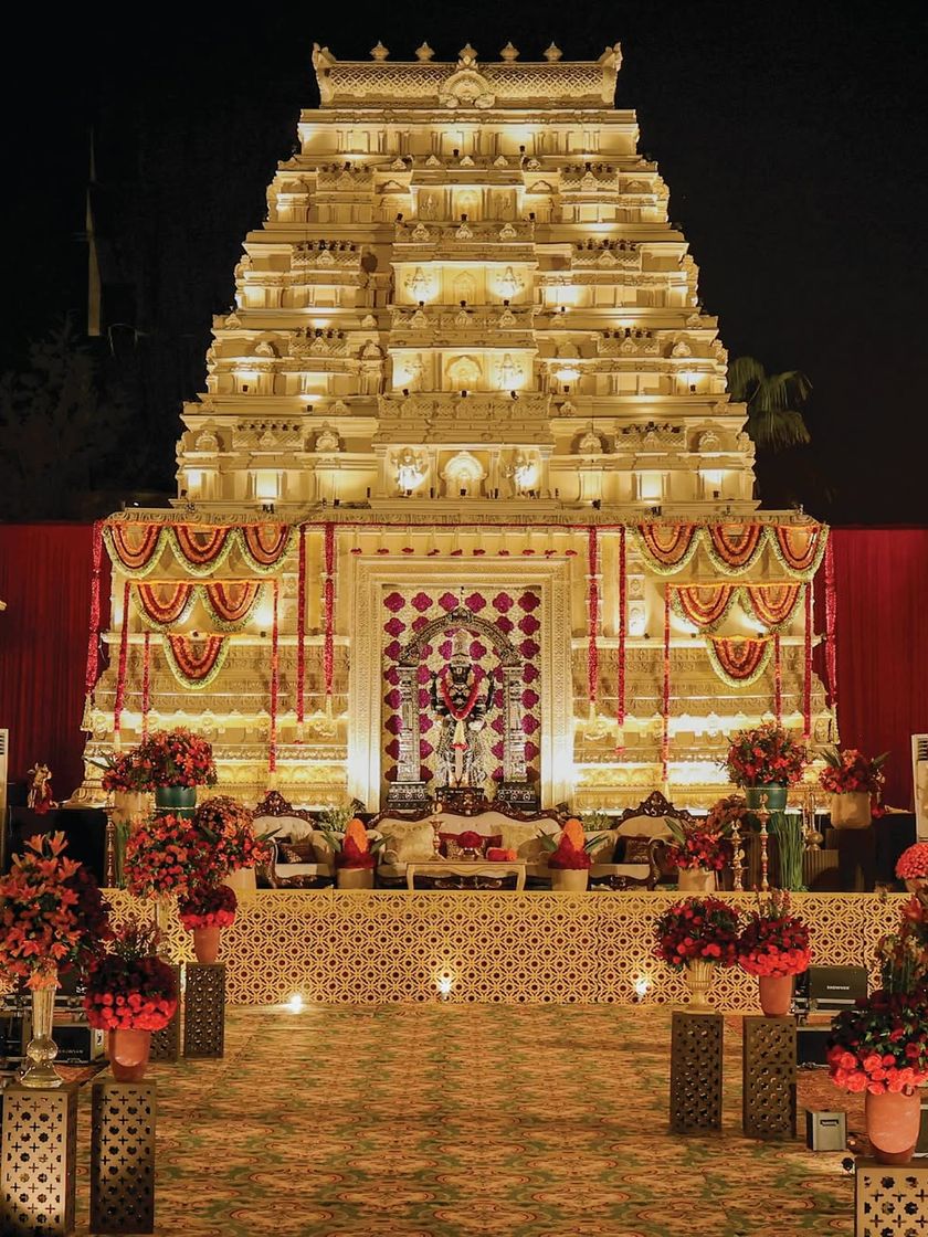 This large scale production, spanning 1.2 lakh sq. ft., was inspired by the regal architecture of the Mysore Palace. I recreated the grandeur of South Indian temple art, from the main Mandira structure paying homage to Tirupati Balaji to the opulent 'Shamiyana' dining expanse and the jade-green Durbar Hall, creating a divine and immersive experience for over 4,000 guests.