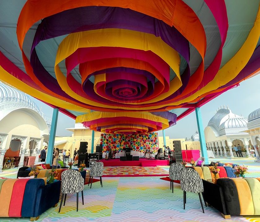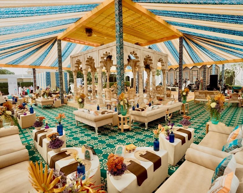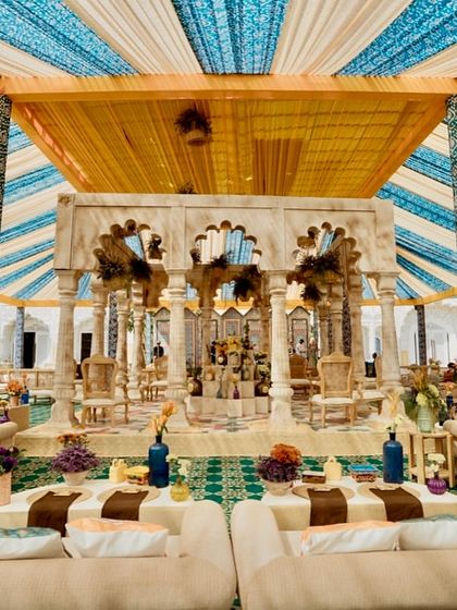 This design captures the vibrant spirit of Rajasthan for a welcoming lunch event. The 'Rang Mahal' or 'Palace of Colors' concept is brought to life with a traditional tented structure in shades of blue, yellow, and green, complemented by carved stone columns, hand-blocked prints, and authentic Rajasthani dining on brass thalis.