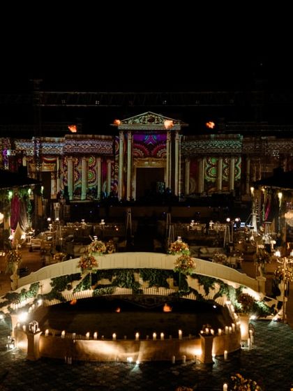 This ambitious project transformed 100,000 sq. ft. of raw land into an immersive world inspired by the architectural wonders of ancient Rome and Petra. The design featured a grotto-style cave entrance, a grand Roman bridge for the ring ceremony, and a monumental 182-foot wide stage, all meticulously crafted to evoke the grandeur and mystique of a forgotten civilization.