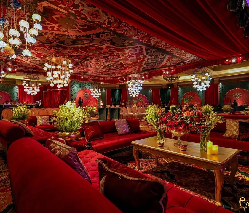 Inspired by the Sufi courts of Delhi and Awadh, this design embodies the ethos of 'Pakeezah', blending beauty (zeenat) with a sense of sanctuary (hifazat). The space is defined by a rich palette of crimson and emerald, intricate Indo-Islamic arches, and the warm glow of mosaic lanterns, creating an atmosphere of spiritual festivity, poetry, and grace.
