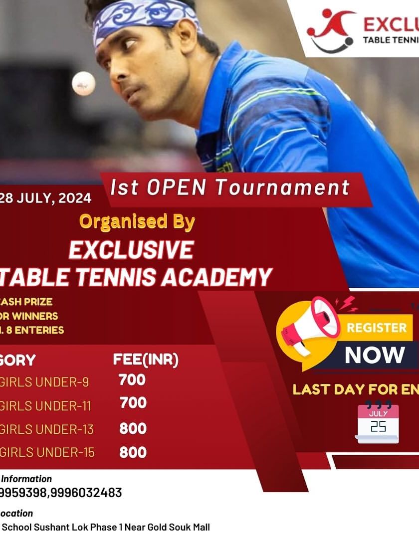 Here you will find all the details for our upcoming open table tennis tournaments in Gurgaon. I organize events for various age groups and skill levels, with clear information on categories, fees, and registration deadlines.