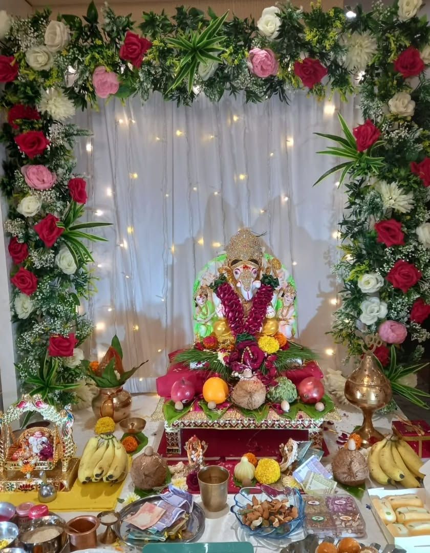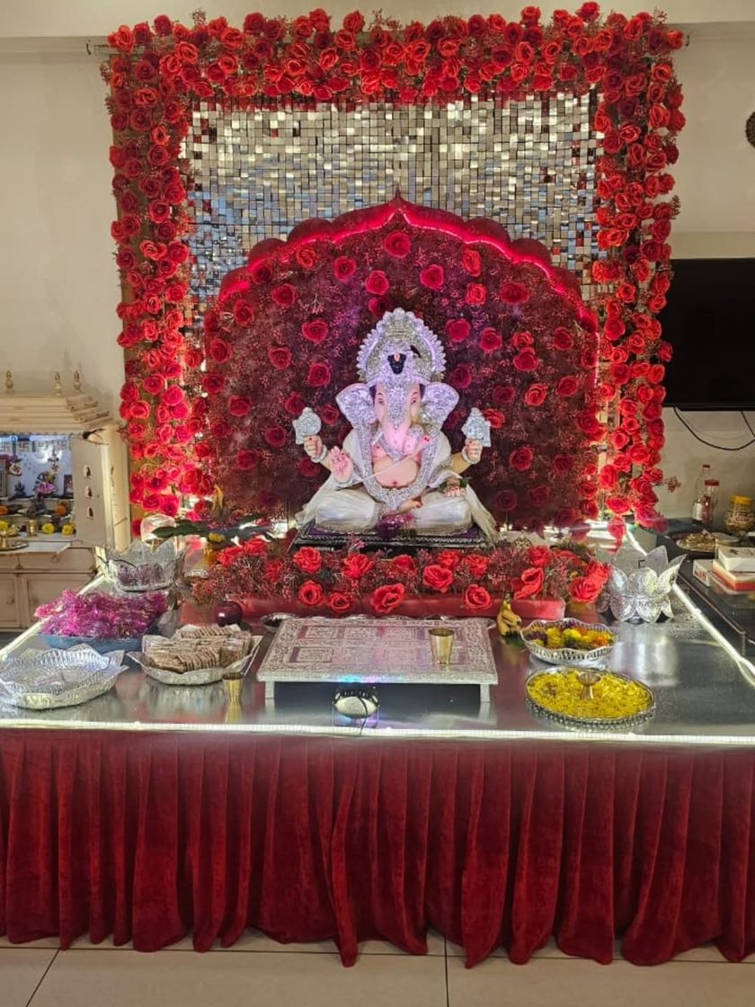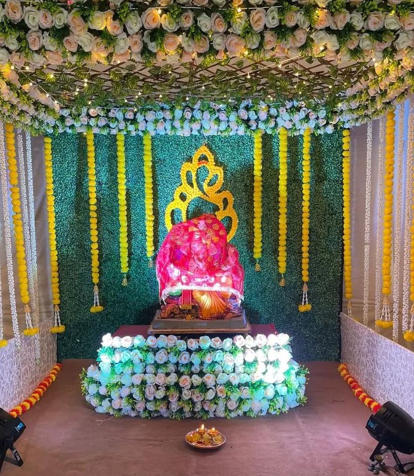 You can never go wrong with a beautiful floral frame for Ganpati. We design a variety of backdrops using different combinations of artificial roses and other flowers, with options for fairy lights to add a festive glow.