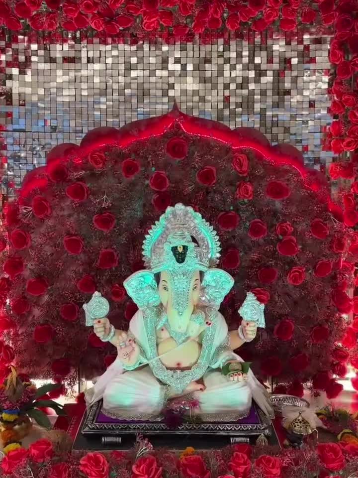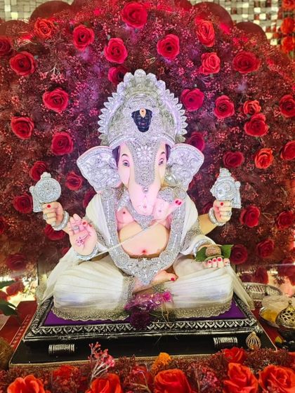 For those who want a truly standout celebration, we create these magnificent backdrops. We use elements like dense red roses and shimmering mirror sequin panels to build a grand stage for Bappa.