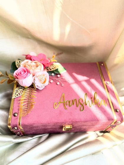 Unboxing is half the fun. I use velvet trunks, wooden crates, baskets, and acrylic boxes, then top them off with flowers, ribbons, and our fairy lights. Real talk, I’m obsessed with making each package look dreamy.
