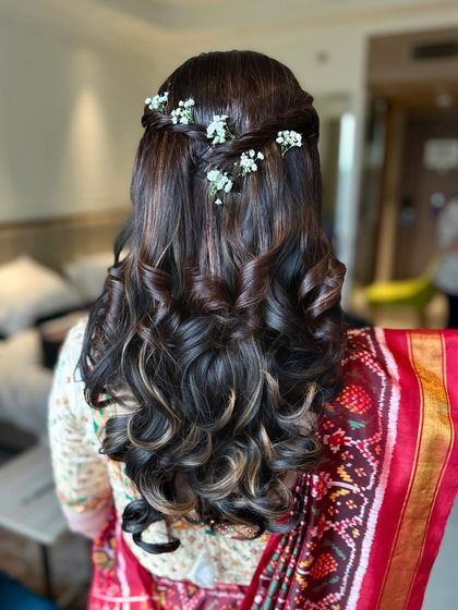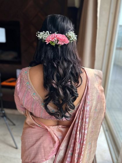 Our collaborative approach ensures your hairstyle harmonizes perfectly with your makeup, creating a cohesive bridal look that enhances your natural beauty while incorporating traditional elements.