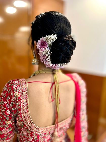 A hairstyle completes the look. I love creating everything from intricate floral buns to dreamy braids and modern ponytails. This gallery showcases a variety of hairstyles with fresh flowers, gajra, and elegant accessories to suit any bridal occasion.