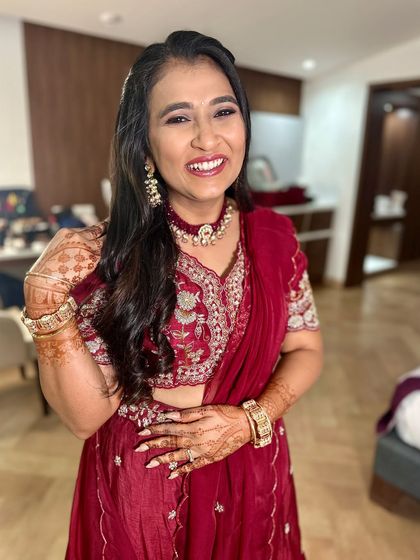 This is the heart of my work, creating classic bridal looks for the main ceremony. I focus on traditional red, pink, and ivory lehengas, paired with my signature soft glam makeup for a radiant and timeless appearance that is flawless in photos and in person.