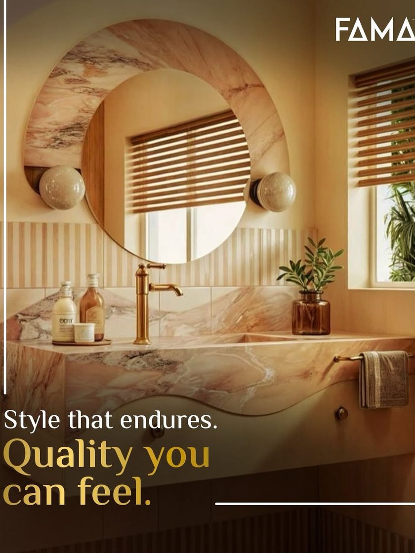 I use a proprietary material called M-Core™ because it offers the perfect balance of beauty and durability. It is 100% moisture-proof, non-porous, scratch-resistant, and hygienic, making it the ideal choice for high-use areas like bathrooms without ever compromising on a luxurious look.