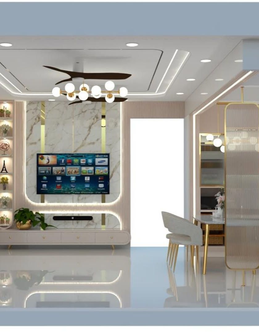 The TV unit is the focal point of the modern living room, and we design ours to be both beautiful and functional. We create wall-mounted and floating designs that open up the floor space, using a mix of materials like warm wood veneers, fluted panels, and luxurious marble-finish laminates. Our signature touch is often integrated LED backlighting to create a cozy and inviting ambiance.