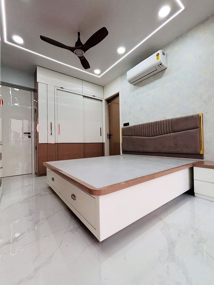 I design bedrooms that are your personal retreat, focusing on both comfort and style. This includes custom beds with hydraulic or drawer storage, integrated dressing units, and TV panels, all complemented by ambient false ceiling lights.
