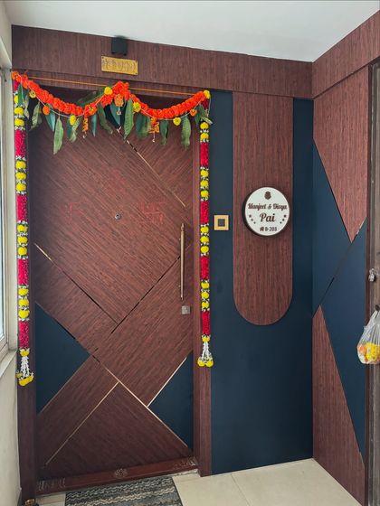 The entrance sets the tone for your home. I design custom main doors and safety doors that are both secure and beautiful, featuring materials like wood, metal jaali work, and unique PU finishes, often complemented by custom nameplates and shoe racks.