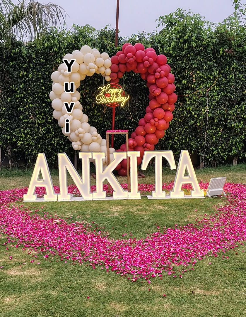 For bigger celebrations, I design large-scale decorations for gardens, living rooms, or event spaces. This includes personalized marquee light-up letters, large balloon arches, and beautiful flower petal arrangements that serve as perfect photo points.
