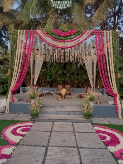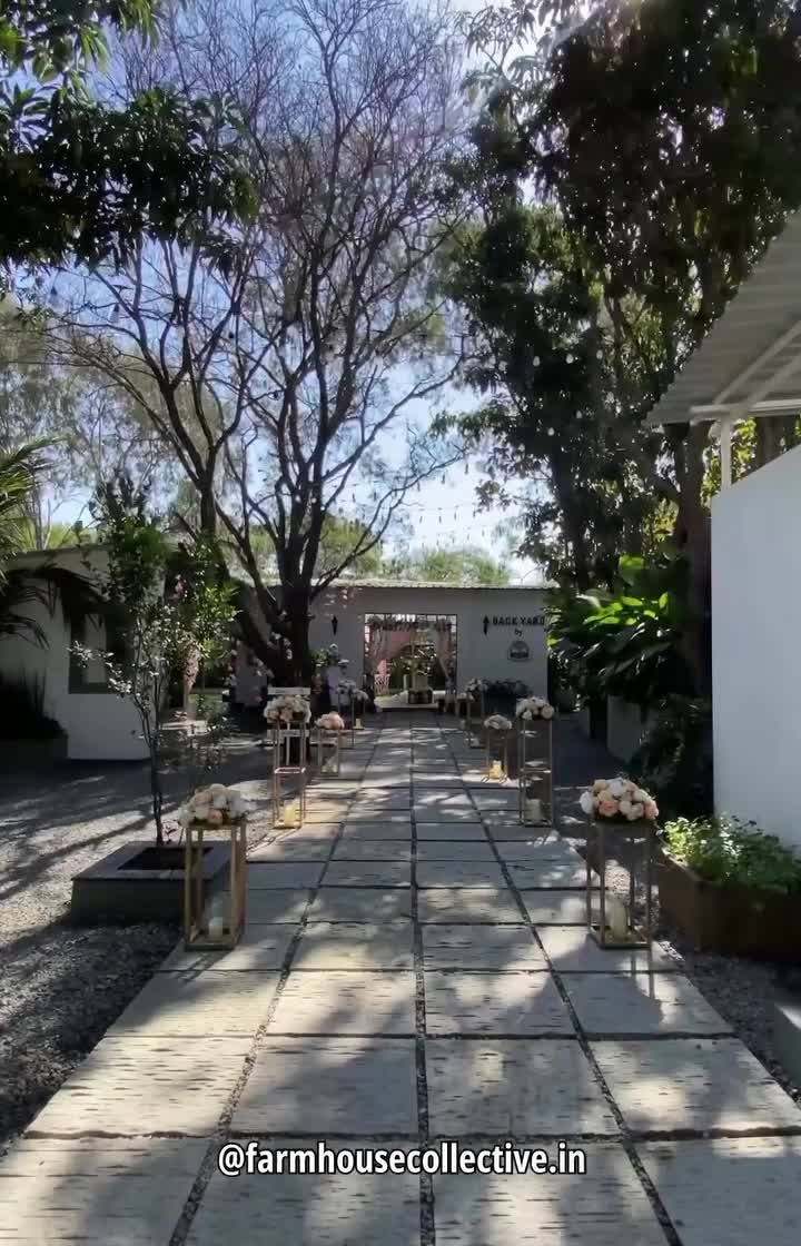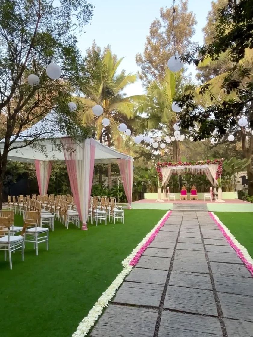 This is our larger venue, designed to host up to 300 guests in a setting that feels both grand and intimate. It features a sprawling green lawn with a main stage, a rustic stone courtyard with a lily pond, and a comfortable two-bedroom AC house for your preparations.