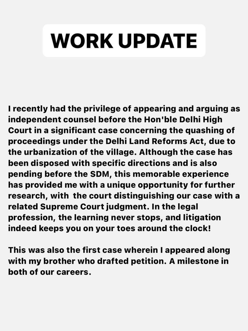 My practice includes representing clients in various High Courts, with a focus on civil litigation, property disputes, and land law. I personally handle cases from start to finish, including matters under the Delhi Land Reforms Act.