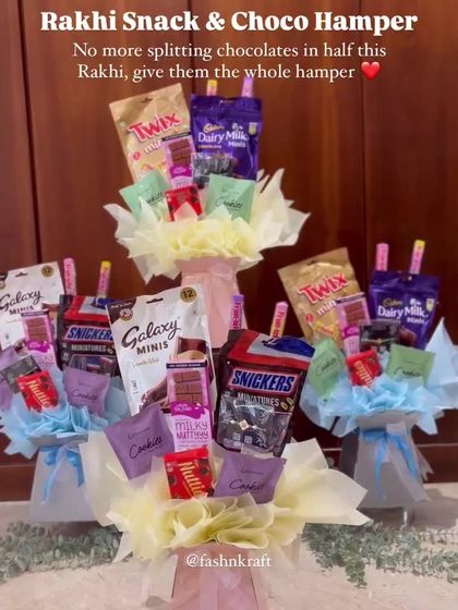 Celebrate the unique bond between siblings with my special Rakhi hampers. From gourmet snack boxes and chocolate bouquets to elegant fruit and floral arrangements with a protective 'nazar' charm, I create gifts that are as full of love as the occasion itself.